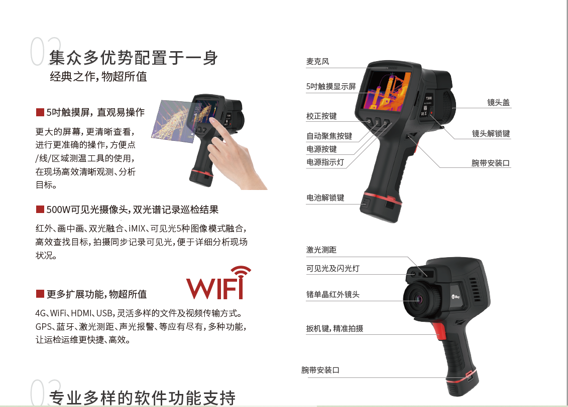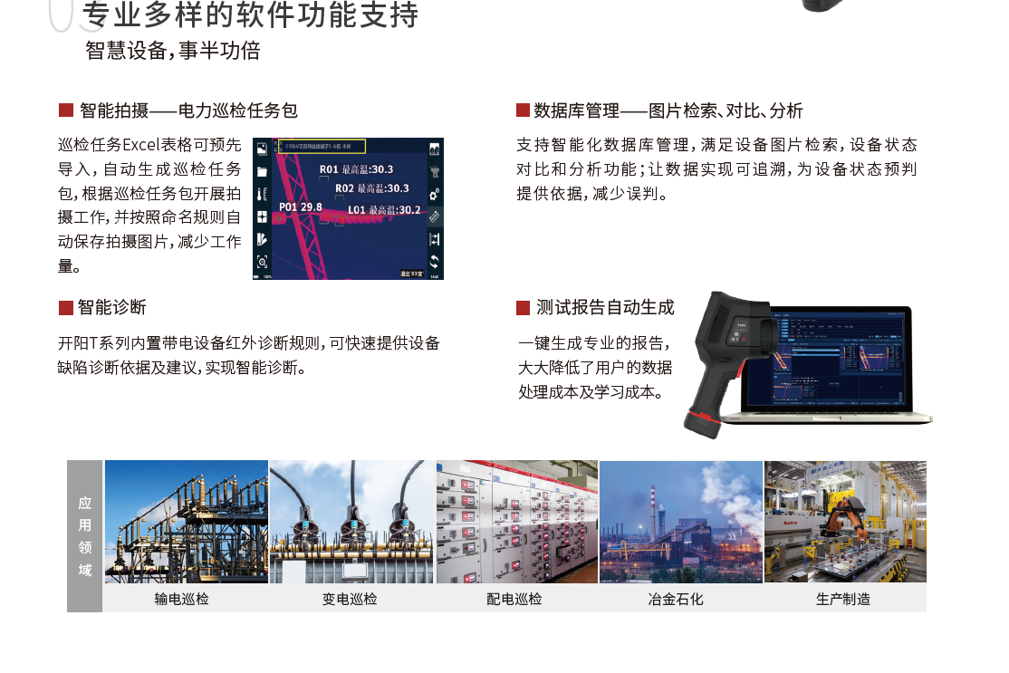 艾睿光电开阳T系列智慧巡检热像仪,搭配自研高性能、高像素、高灵敏度中国“芯”VOx红外探测器,是艾睿光电首款自动对焦、可更换镜头的高性能红外热像仪。强大的硬件配置在生产设备巡检、制程工艺检查、冶金化工等应用中表现优异,在软件功能方面也实现更多突破⸺智能拍摄(巡检任务包)、智能数据库管理(图片检索、对比、分析)、智能诊断等功能,为电力行业用户提供了全面的高效巡检解决方案。